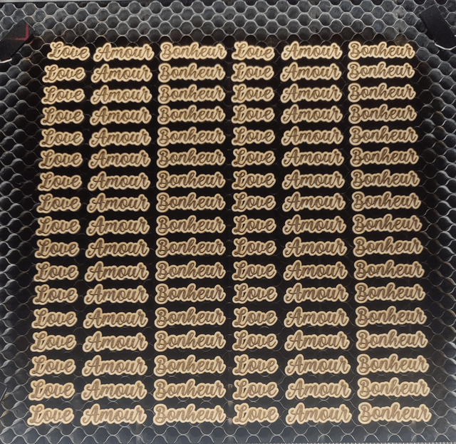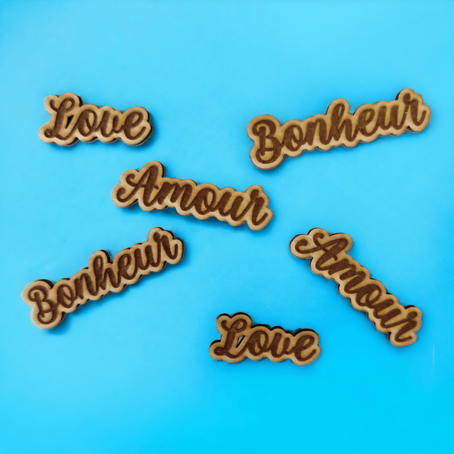 Petits mots en bois gravés à déposer. Gravé puis découpé sur du contreplaqué 3 mm d'épaisseur. Le nombre de pièces dépend de la longueur du mot. Bonheur : 51 mm par 15 mm vendus par 85, Love : 32.5 mm par 15 mm vendus par 136, Amour : 46 mm par 15 mm vendus par 102. Mélange des 3 : 102 pièces. Pour choisir votre graphisme merci de nous contacter via le formulaire "Nous contacter" en précisant le thème que vous souhaitez (par exemple "Bonheur gravé" ou "Amour gravé") ou envoyez une photo de votre projet. Nous vous enverrons le projet par mail. Vous pourrez ensuite passer la commande en ligne. Délai de fabrication 2 à 10 jours ouvrés, délai de livraison 2 à 3 jours ouvrés.